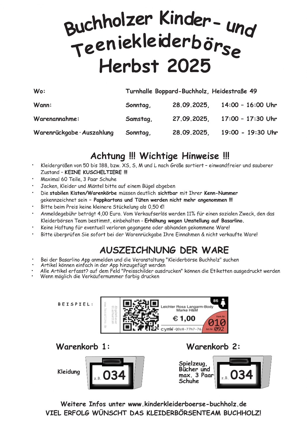 bitte denkt bei der Warenabgabe an die Sortierung nach Kleidung und Spielzeug.